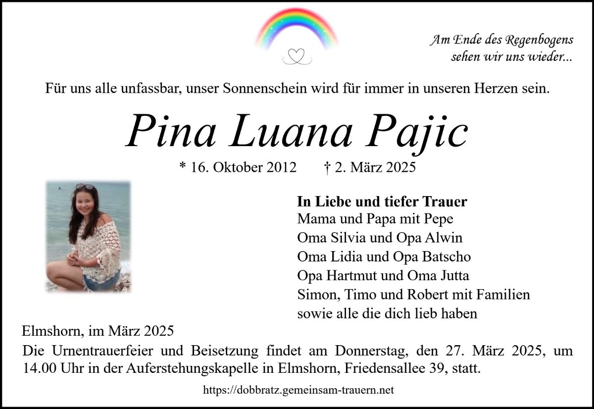 ich wünsche euch alles erdenklich gute. Heute ist ein schwerer Tag, aber Pina ist stolz auf euch und begleitet euch jeden Tag. Feiert für Pina und denkt an sie, heute ist ihr Tag. So schwer es heute auch wird, vergesst nicht, dass ihr auch noch lachen dürft, lacht, seid glücklich und feiert, als wäre Pina noch da. Ich glaube das würde sie freuen.